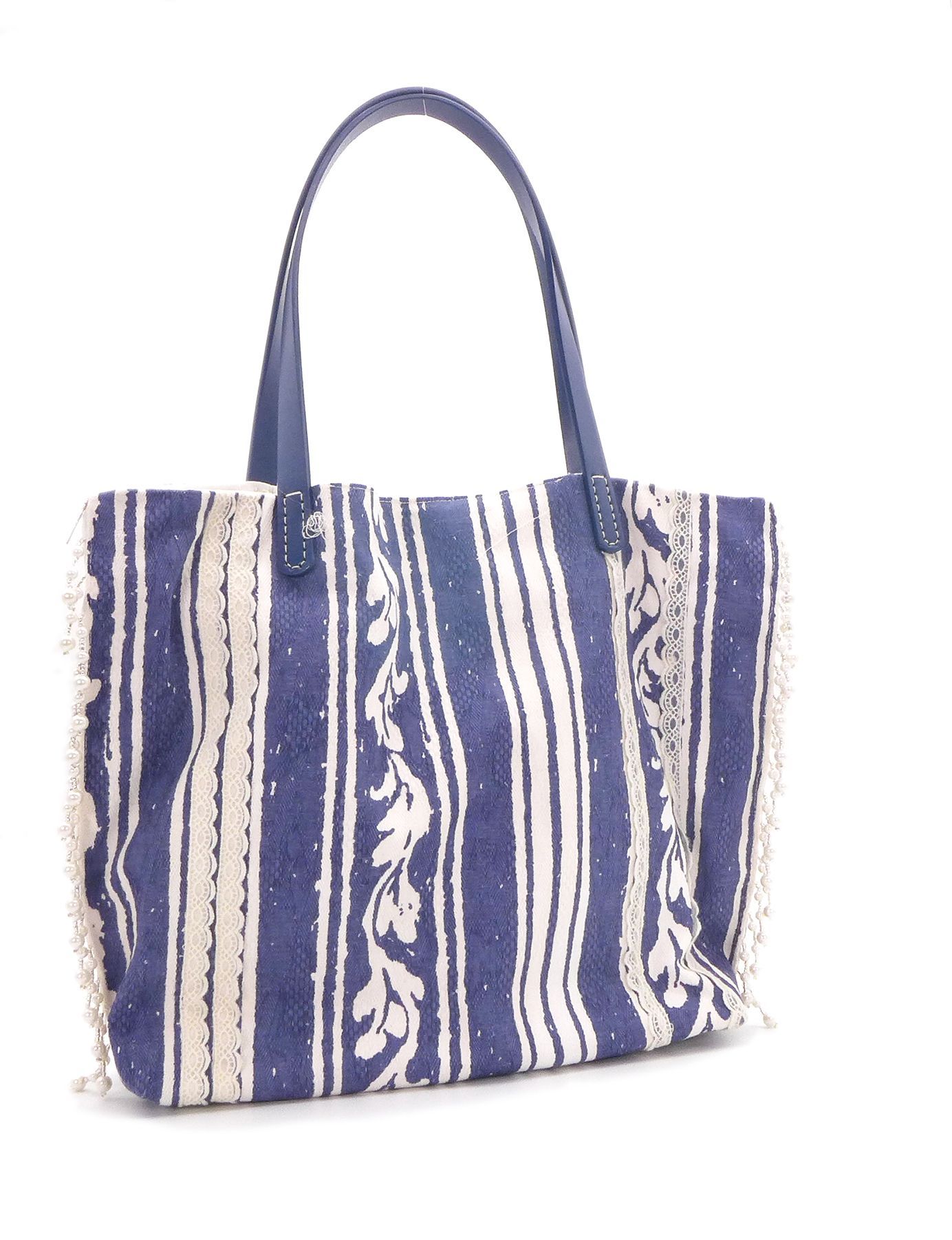 Die große Vordertasche prägt das Design – funktional, elegant, mit einem Hauch Romantik. Dunkelblaue Henkel aus PU-Leder bringen Struktur und Balance, der verstärkte Boden Stabilität und Form. Das helle Baumwollfutter innen betont die Leichtigkeit – offen, freundlich, echt.