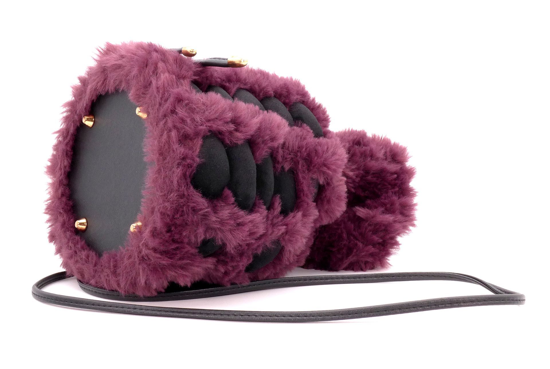 ist ein moderner Beutel, der zum Träumen einlädt und mit jedem Detail verführt. Der beerige Fake Fur in tiefem Plum-Ton ist nicht nur ein Eyecatcher, sondern auch ein sinnliches Erlebnis: weich, warm und intensiv. Die samtigen, schwarzen Schlaufen, die sich wie eine rhythmische Struktur um den Korpus legen, verleihen dem Modell seine markante Tiefe und erinnern an ein kunstvolles Ornament.