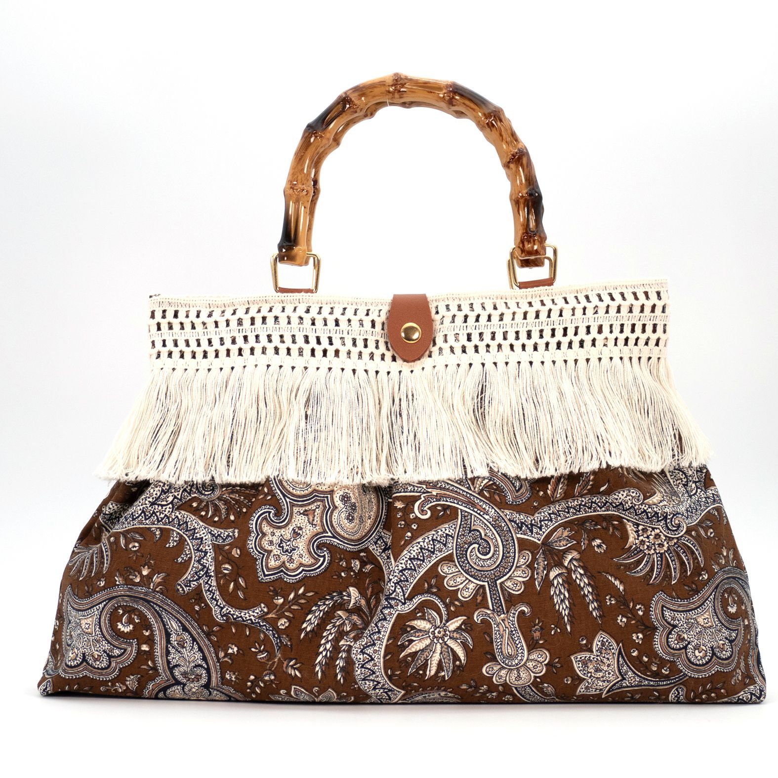 Der obere Abschluss aus grober Borte und schwingenden Fransen verleiht ihr eine verspielte, künstlerische Note, während die Bambusgriffe Wärme und Natürlichkeit betonen. Die geräumige Form bietet genügend Platz für deine Essentials, während der Magnetverschluss für sicheren Halt sorgt.
