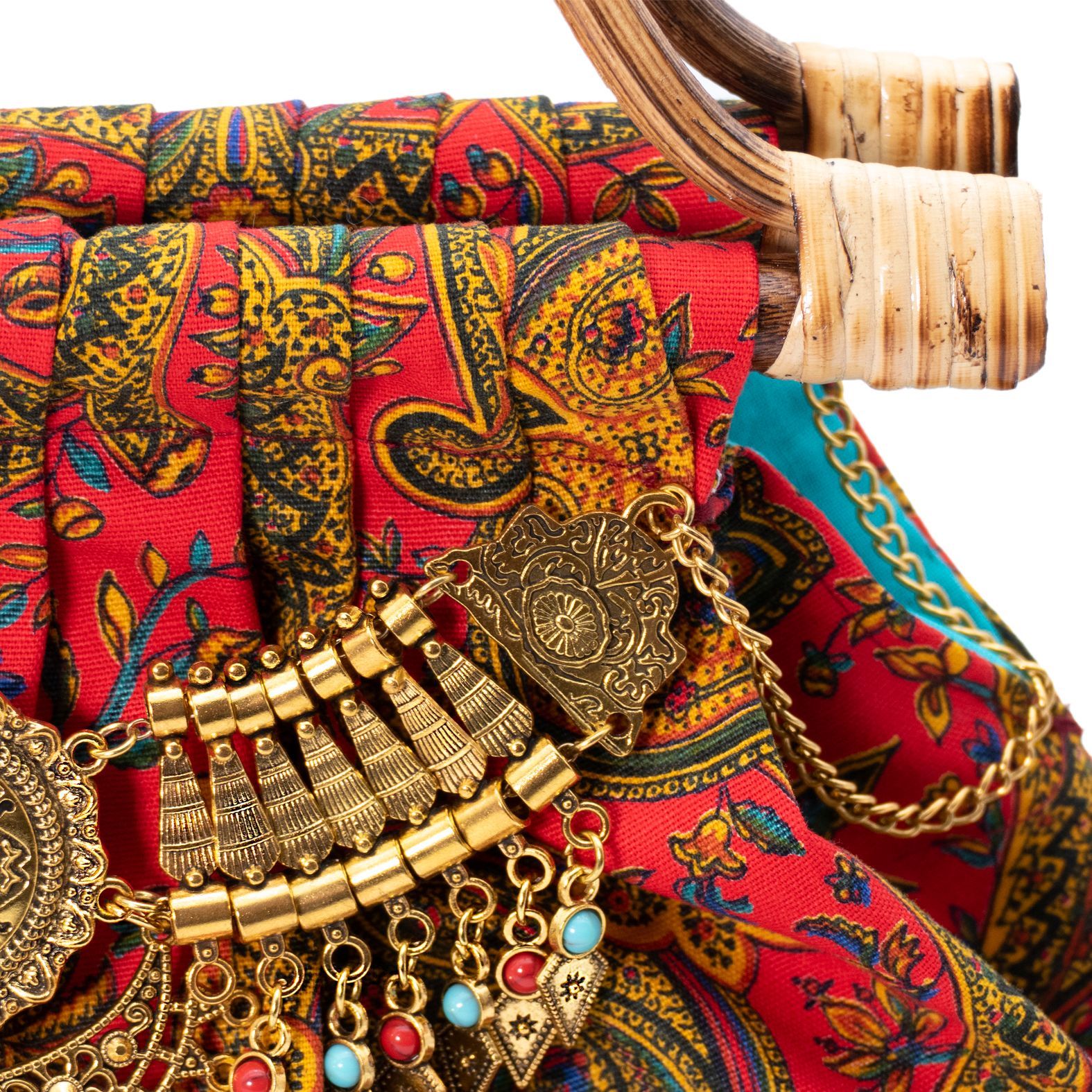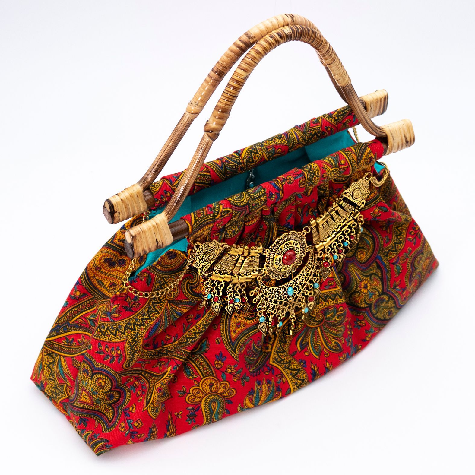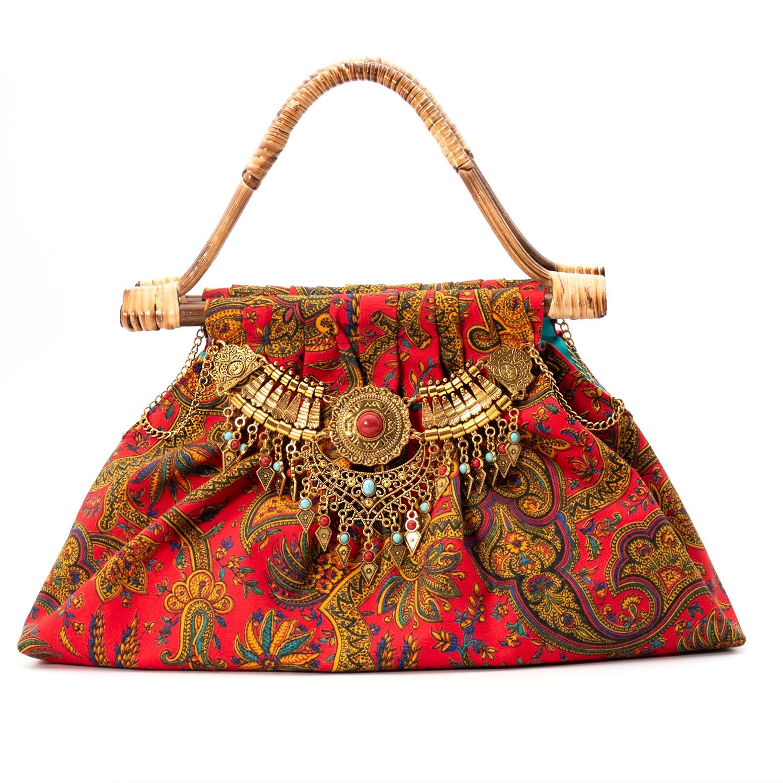 vereint die Sinnlichkeit kräftiger Farben mit der Eleganz des klassischen Paisley-Musters. Ihr intensives Rot fängt den Zauber ferner Länder ein, während das aufwendig gearbeitete Schmuckelement an der Vorderseite einen Hauch von Mystik und Opulenz verleiht.