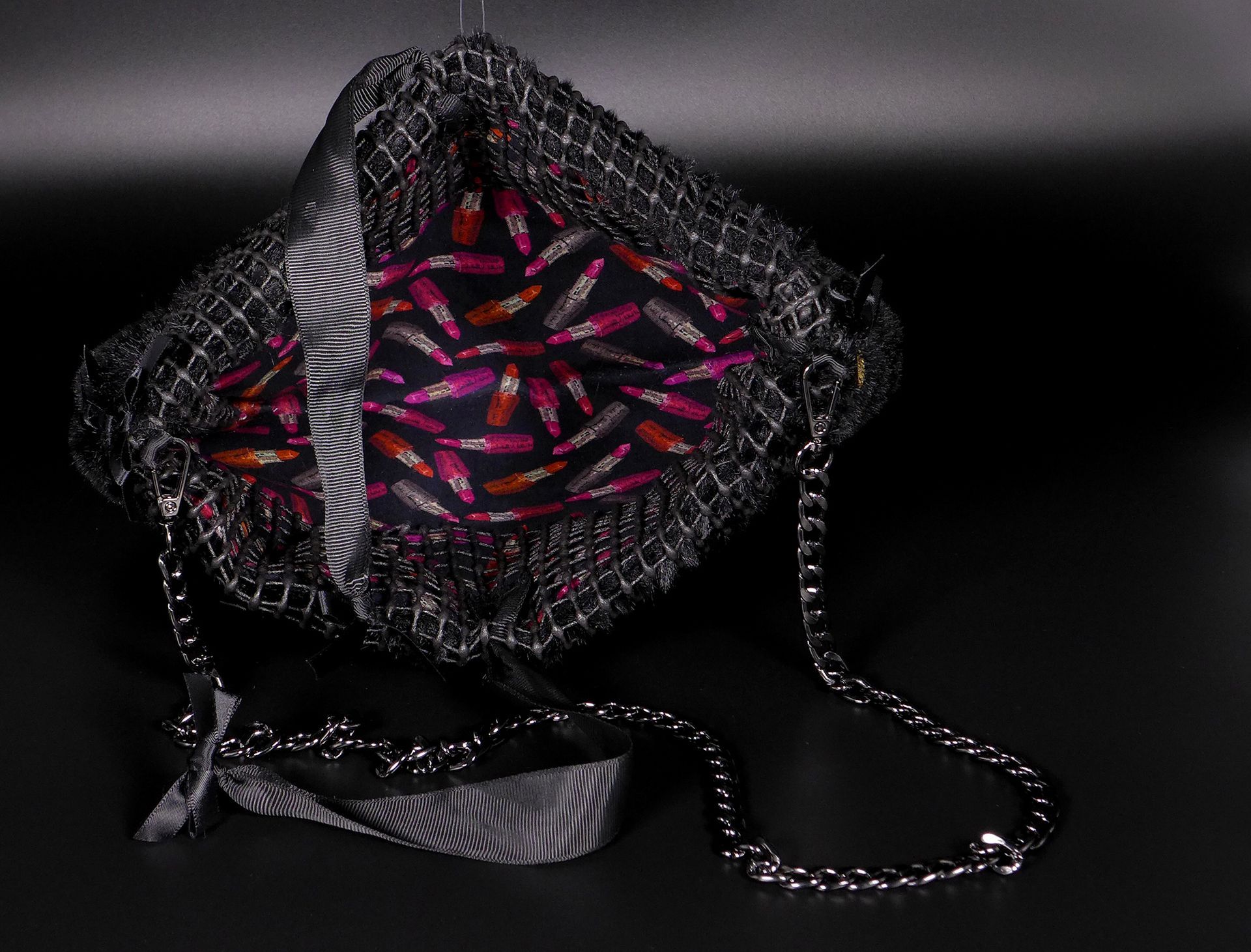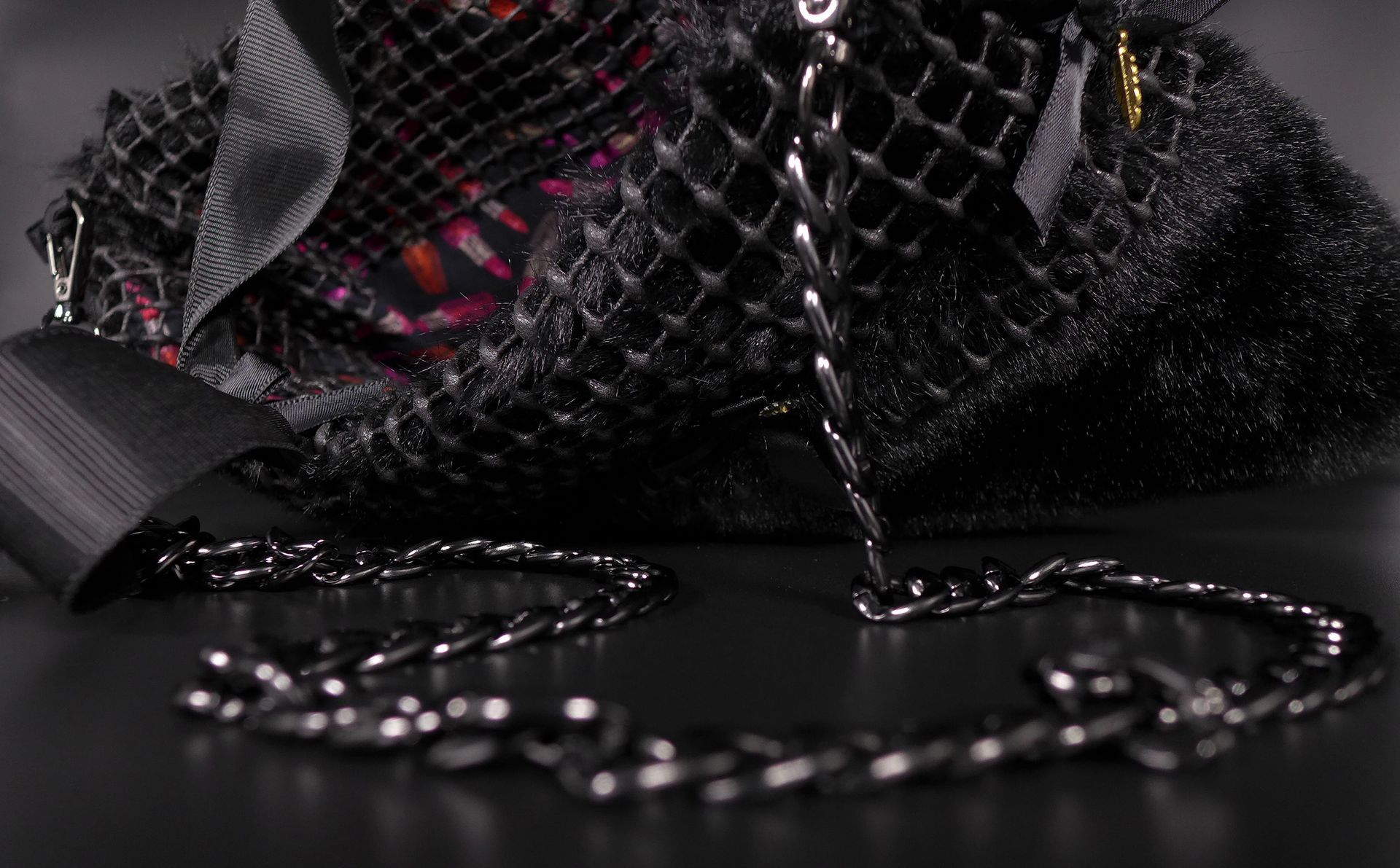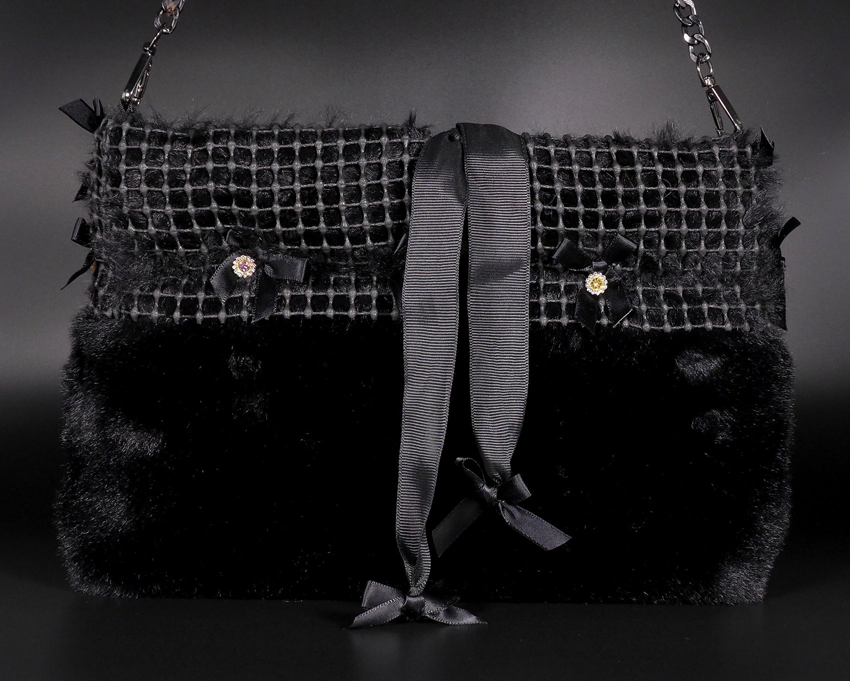 Diese Umhängetasche steht für urbanen Luxus mit Seele. Weiches, schwarzes Fake Fur bildet die Basis, während ein grobes Gitternetz, feine Satinbänder und funkelnde Glaselemente das Design in Bewegung bringen. Typisch ALjESKA – ein Spiel mit Materialien, gemischt mit subtiler Provokation.
