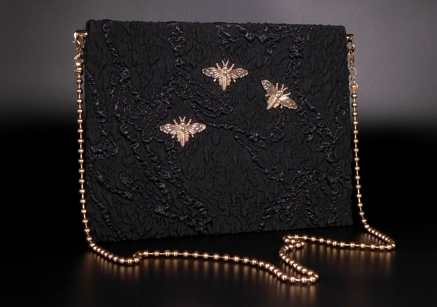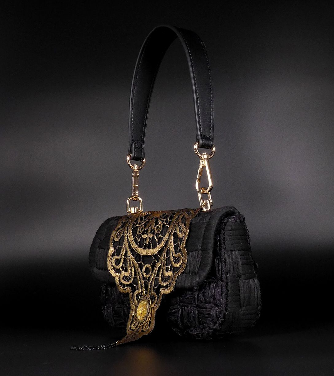 Ein Hauch Vergangenheit. Ein Statement der Gegenwart. Schwarze Spitze, Tüll und feine Ornamentik formen eine Clutch, die wie ein Fächer aus Licht und Schatten wirkt. Opulent, kunstvoll, unverwechselbar. Für Momente voller Ausdruck – im Hellen wie im Dunkeln.