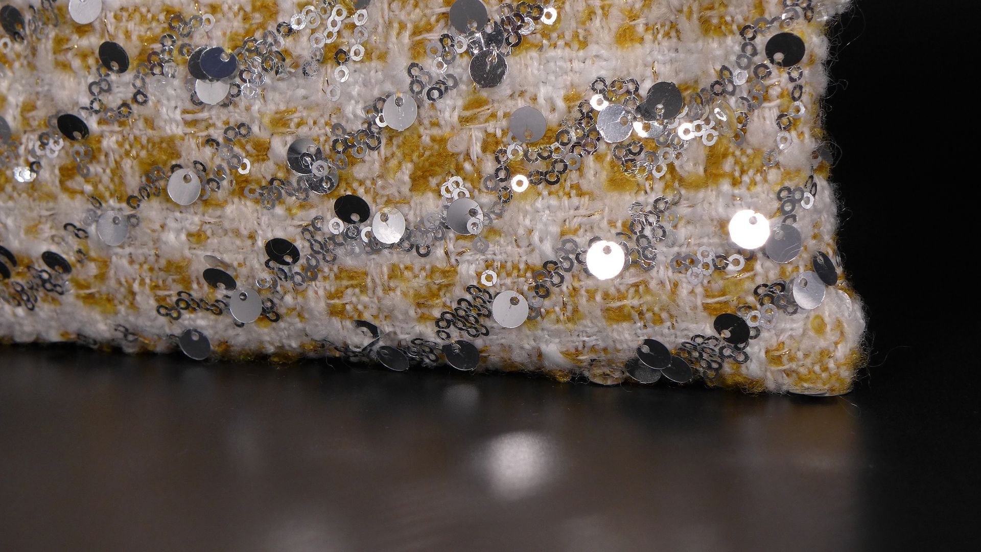 Ein Hauch Licht im Dunkel – eingefangen in feinem Bouclé. Über das Gewebe fließen silberne Pailletten, zart und doch lebendig – wie Morgentau auf Stoff gebannt. Das kleine Accessoire begleitet, ohne sich aufzudrängen – leise, elegant, vollkommen ALjESKA.